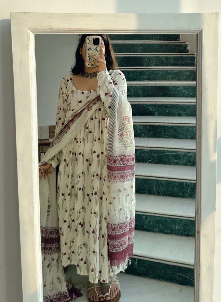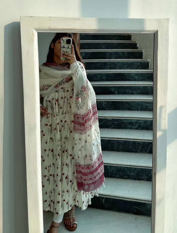 Elegant and timeless, the Rose Petal Set is a three-piece Anarkali ensemble crafted in soft cotton with a beautifully flowing silhouette. Featuring a normal deep back with tassel dori and a graceful 2.5-meter Chanderi dupatta, it exudes understated charm perfect for festive gatherings and special occasions.