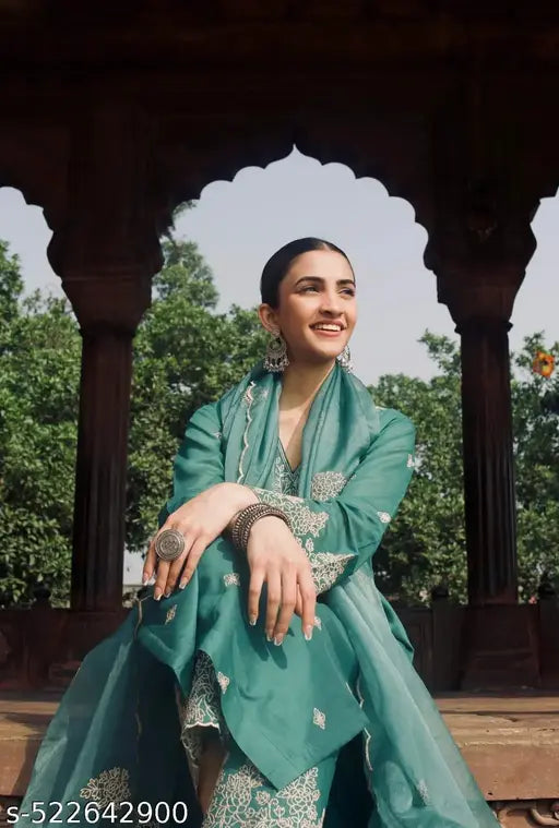 • Floral Embroidered Regular Thread Work Straight Kurta with Palazzos & Dupatta